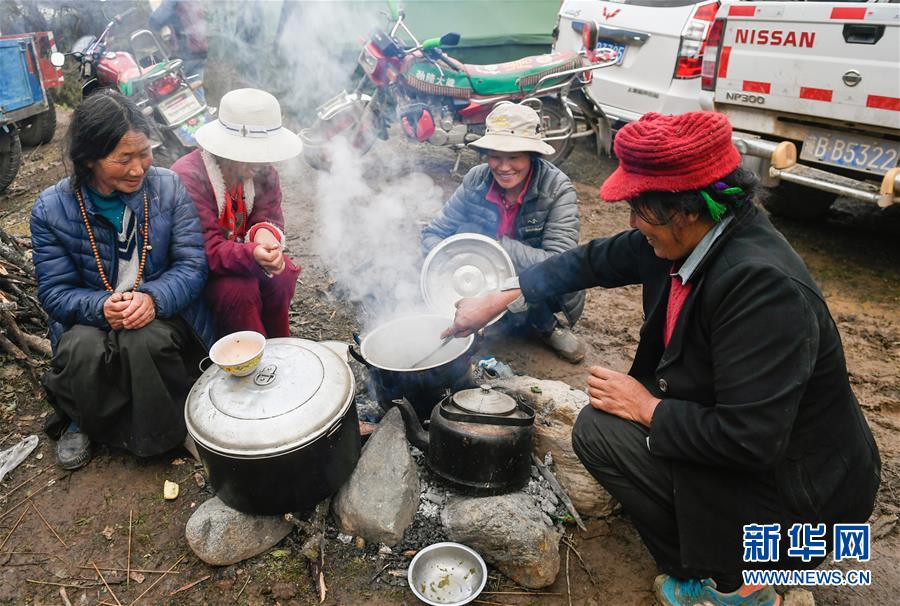 波羅鄉(xiāng)一臨時(shí)安置點(diǎn)內(nèi)的群眾在燒水做飯(10月14日攝)。 新華社記者 劉東君 攝