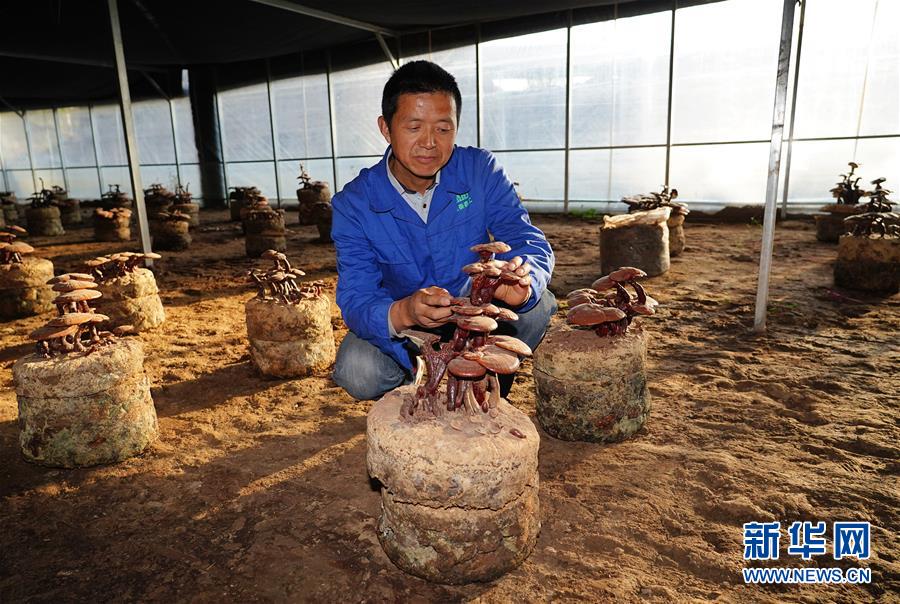 10月15日,技術(shù)員楊茂鵬在黃連河村林下生態(tài)產(chǎn)業(yè)園的大棚內(nèi)查看靈芝盆景。新華社記者邵瑞 攝