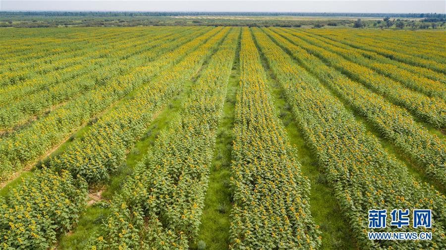 內(nèi)蒙古達拉特旗白土梁林場的沙棘葵花套種田(8月1日無人機拍攝)。 新華社記者張善臣攝
