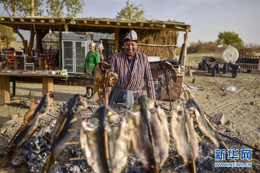 10月16日,在羅布人村寨,村民阿木東·艾不東在制作烤魚(yú)。新華社記者 趙戈 攝