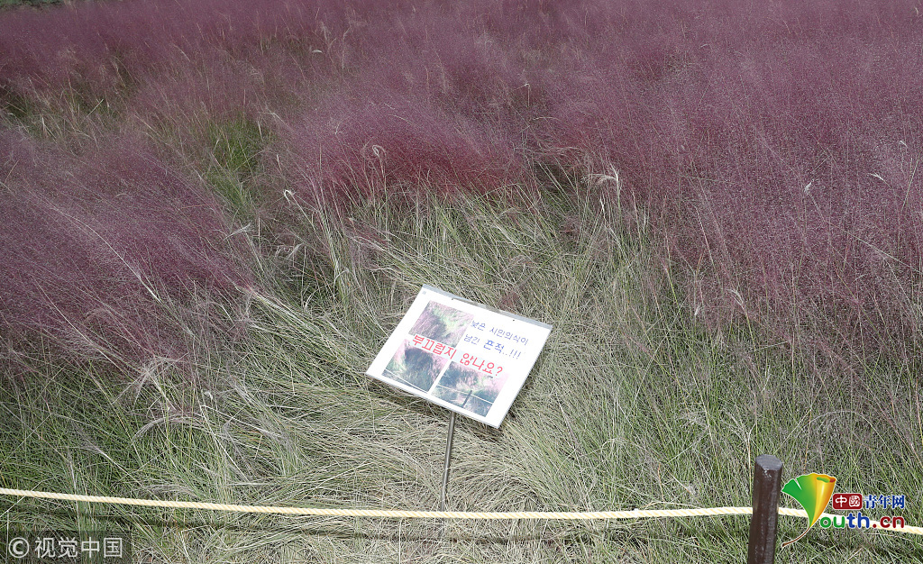 當(dāng)?shù)貢r(shí)間2018年10月16日,韓國(guó)蔚山,近日,蔚山公園大片粉黛亂子草盛開,粉紅花海浪漫十足,但部分花海遭游客隨意踩踏。公園并沒(méi)有修復(fù)遭破壞區(qū)域,而是用繩索圍起并掛上批判性告示,呼吁游客腳下留情。圖片作者:Yonhap News Agency