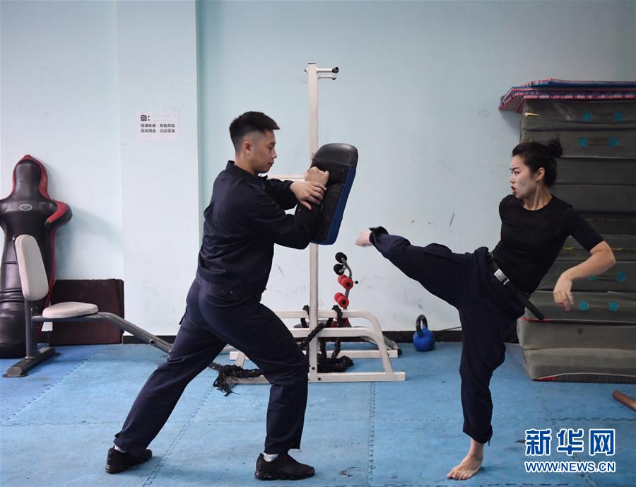 10月16日,湯春燕在健身房內(nèi)進行擒敵訓練。 新華社記者王全超攝