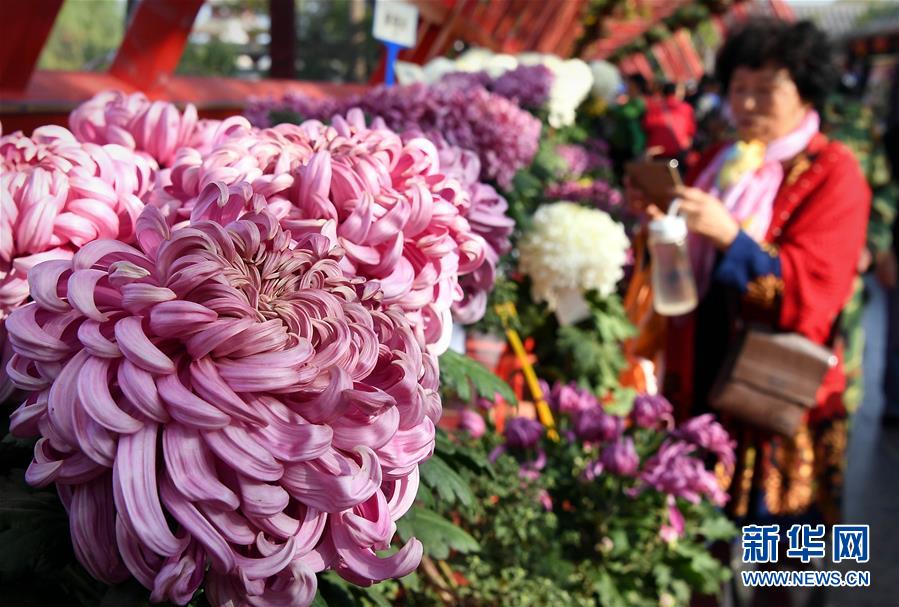 10月17日,游客在開(kāi)封清明上河園觀賞菊花。重陽(yáng)時(shí)節(jié),各色菊花競(jìng)相綻放,把古都開(kāi)封裝點(diǎn)得分外秀美,吸引眾多游客前來(lái)觀賞游玩。 新華社記者 李安 攝