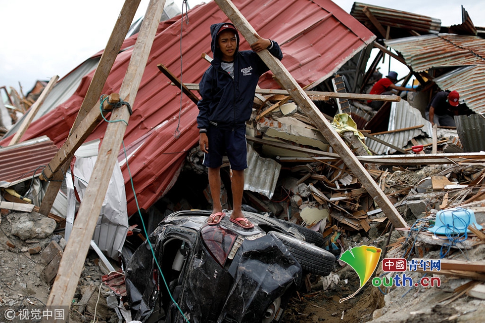 當(dāng)?shù)貢r(shí)間2018年10月11日,印尼帕盧,15歲的Ikhmal Yudanto站在他母親的汽車上,汽車在地震中被嚴(yán)重毀壞。