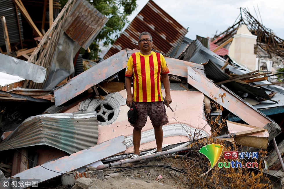 當(dāng)?shù)貢r(shí)間2018年10月11日,印尼帕盧,43歲的農(nóng)民Ahmad在廢墟旁邊,這里曾經(jīng)是他的家。他希望能找到妻子和兩個(gè)女兒的遺體。他的三女兒被發(fā)現(xiàn)時(shí)受了重傷,現(xiàn)在正在醫(yī)院接受治療。