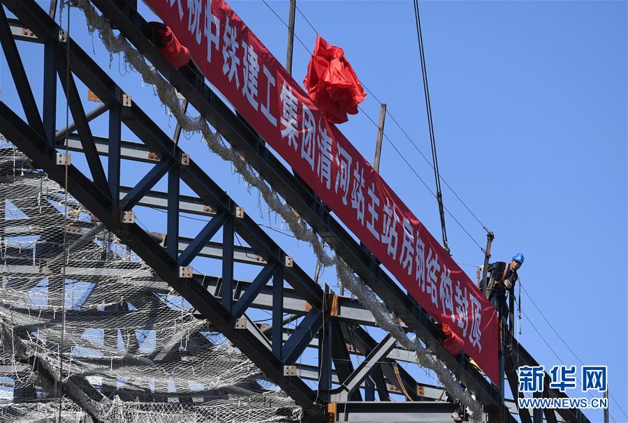 10月17日,工作人員在吊裝鋼梁。當(dāng)日,京張高鐵新建車站——清河站主體結(jié)構(gòu)正式封頂。清河站是京張高鐵建筑面積最大的車站,同時(shí)也是京張高鐵在北京地區(qū)的始發(fā)站之一。 新華社記者 邢廣利 攝