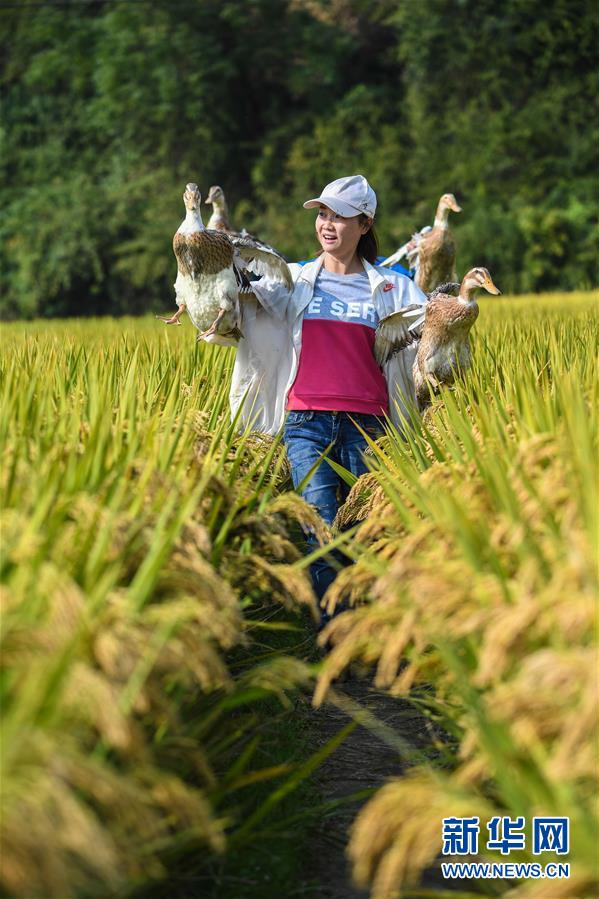 10月17日,種植基地負(fù)責(zé)人陳梅芳抓住幾只稻田放養(yǎng)的鴨子。 新華社記者 徐昱 攝
