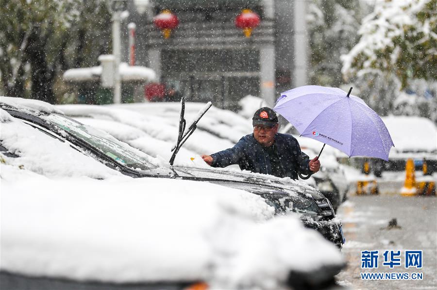 10月18日,烏魯木齊市民在清理車上的積雪。當(dāng)日,新疆烏魯木齊迎來一場降雪。 新華社記者 江文耀 攝