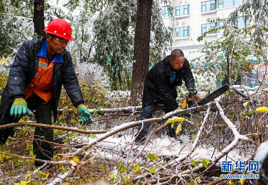 10月18日,工作人員在烏魯木齊清理被積雪壓斷的樹木。當(dāng)日,新疆烏魯木齊迎來一場(chǎng)降雪。 新華社記者 江文耀 攝