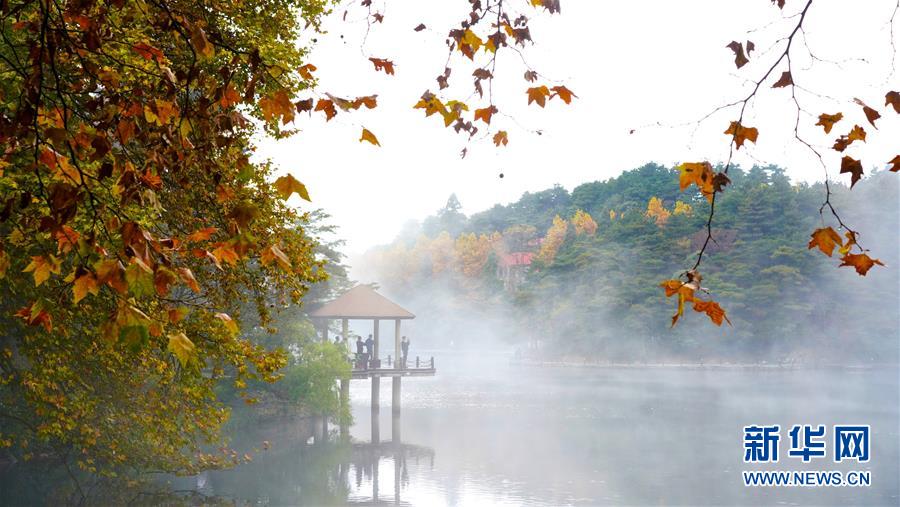 當(dāng)日,位于江西省九江市廬山風(fēng)景區(qū)內(nèi)的如琴湖云霧繚繞,層林盡染,吸引眾多游客前來觀賞游玩。