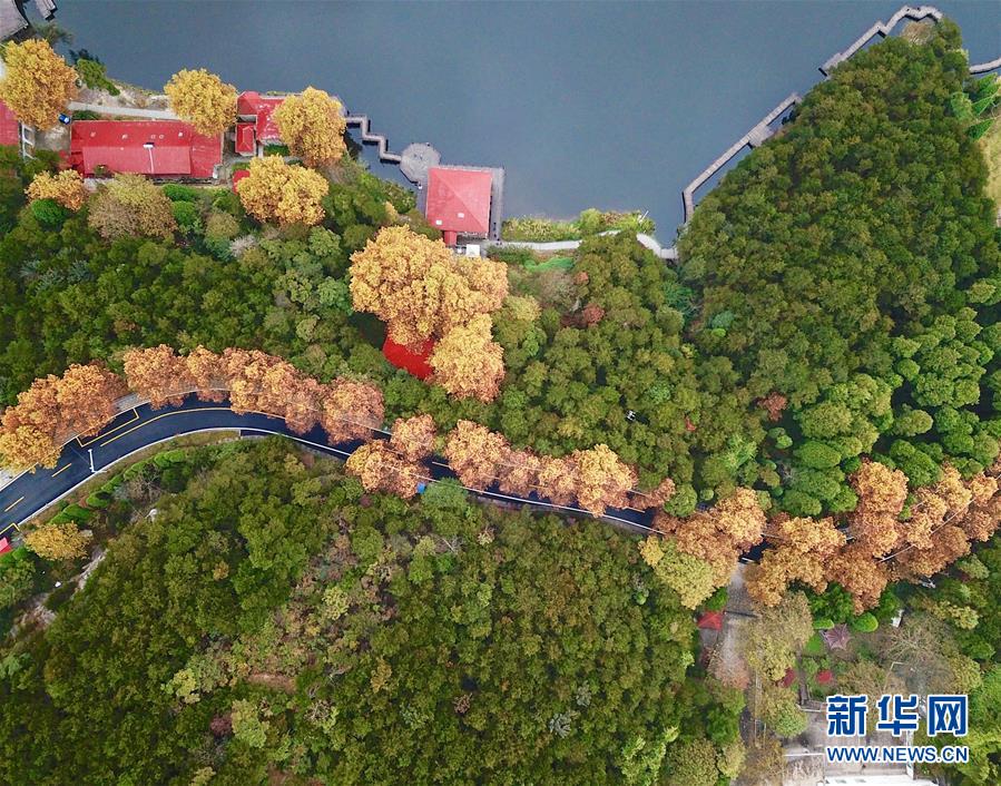 這是如琴湖旁公路的秋色風(fēng)光(10月20日無人機(jī)拍攝)。 新華社記者 胡晨歡 攝