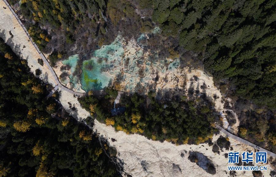 俯瞰黃龍溝五彩池一角,彩池錯落有致,宛如層層玉盤(10月19日無人機拍攝)。 深秋時節(jié),在雪山、藍天、白云和彩林映襯下,黃龍溝中的彩池色彩更加斑斕,目前黃龍景區(qū)進入觀賞最佳時節(jié)。黃龍風景名勝區(qū)位于四川省松潘縣境內(nèi),以彩池、灘流、雪山、峽谷、森林等聞名,享有“人間瑤池”“圣地仙境”之美譽。新華社記者 江宏景攝