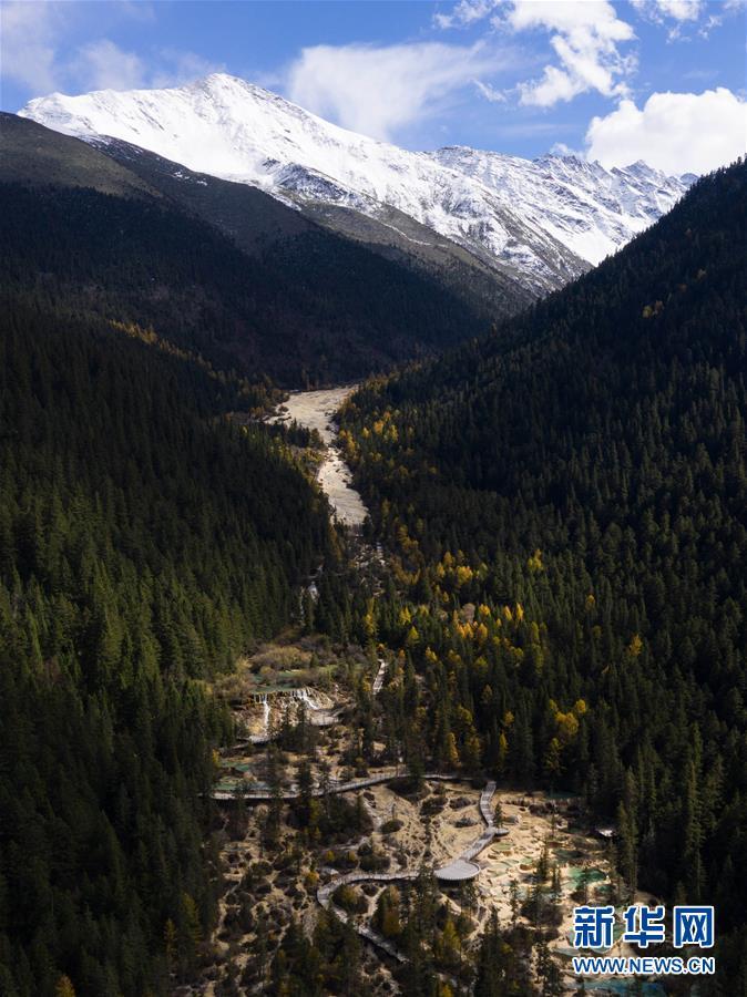 黃龍溝在藍(lán)天白云、雪山和彩林的映襯下風(fēng)景如畫(huà)(10月19日無(wú)人機(jī)攝)。深秋時(shí)節(jié),在雪山、藍(lán)天、白云和彩林映襯下,黃龍溝中的彩池色彩更加斑斕,目前黃龍景區(qū)進(jìn)入觀賞最佳時(shí)節(jié)。黃龍風(fēng)景名勝區(qū)位于四川省松潘縣境內(nèi),以彩池、灘流、雪山、峽谷、森林等聞名,享有“人間瑤池”“圣地仙境”之美譽(yù)。新華社記者 江宏景攝