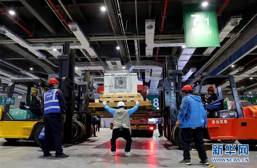 10月22日,“金牛座”龍門銑床床身(前)等待裝運(yùn)。 當(dāng)日,來自德國(guó)的首屆進(jìn)口博覽會(huì)最大展品——“金牛座”龍門銑床完成初步組裝,將運(yùn)往國(guó)家會(huì)展中心(上海)3號(hào)館進(jìn)行最后的安裝施工。這是德國(guó)瓦德里??票す狙邪l(fā)的機(jī)床設(shè)備,高約8米,占地面積約200平方米,將在智能及高端裝備區(qū)進(jìn)行展出。 新華社記者方喆攝