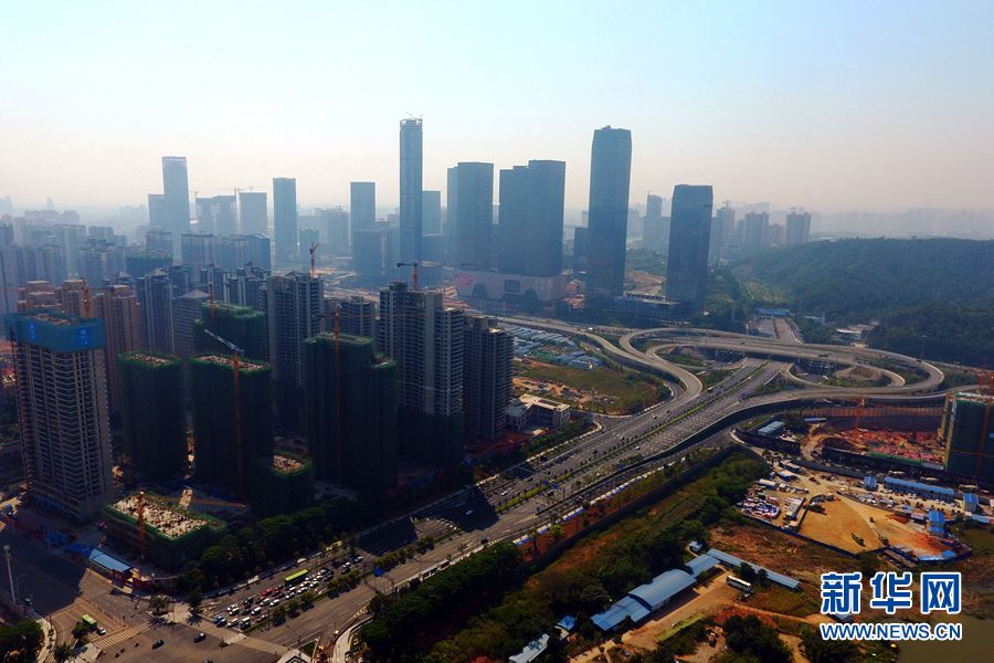 廣西南寧五象新區(qū)地處邕江之南,東起八尺江,西鄰水塘江,北起邕江,南望濱海,規(guī)劃面積約200平方公里。新區(qū)將規(guī)劃建設成為南寧市構建區(qū)域性商貿(mào)物流基地、先進制造業(yè)基地、面向東盟的大型企業(yè)總部基地及文化交流展示合作的重要樞紐、信息中心及金融中心的重要支撐的現(xiàn)代新城。圖為無人機航拍建設中的五象新區(qū)(攝于2018年10月7日)。新華網(wǎng)發(fā) 韋秀玲攝