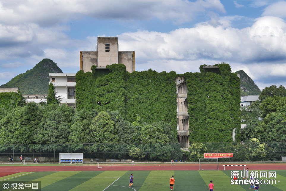 2018年6月20日,貴陽,貴州大學(xué)現(xiàn)12層樓近50米高綠色“巨瀑”。據(jù)悉,這是該校的老師們?cè)?6年前栽種的300多棵爬山虎,如今爬滿12層高的圖書館大樓,猶如“綠色城堡”。