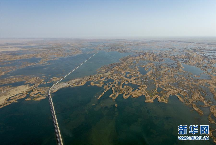 218國道在塔里木河尾閭——臺特瑪湖中間延伸(2017年10月22日無人機拍攝)。 新華社記者 趙戈 攝