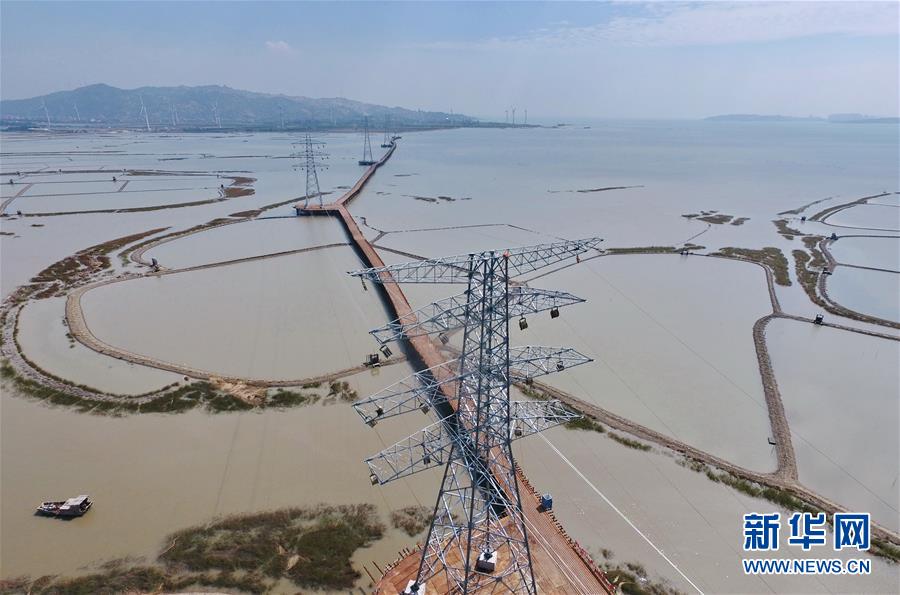 這是建在莆田平海灣上的輸送風(fēng)電鐵塔和橫跨平海灣的全路徑棧橋(10月25日無人機(jī)拍攝)。 新華社記者林善傳攝