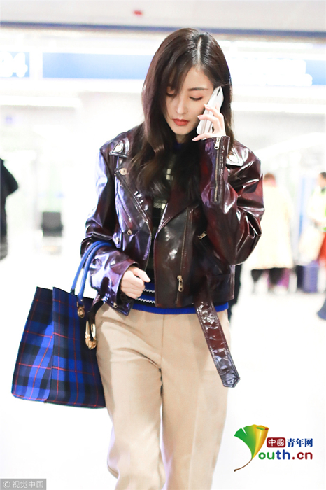 2018年10月25日,北京,張?zhí)鞇郜F(xiàn)身機(jī)場(chǎng),她身穿短款漆皮夾克時(shí)尚帥氣,低頭疾走打電話星范十足。