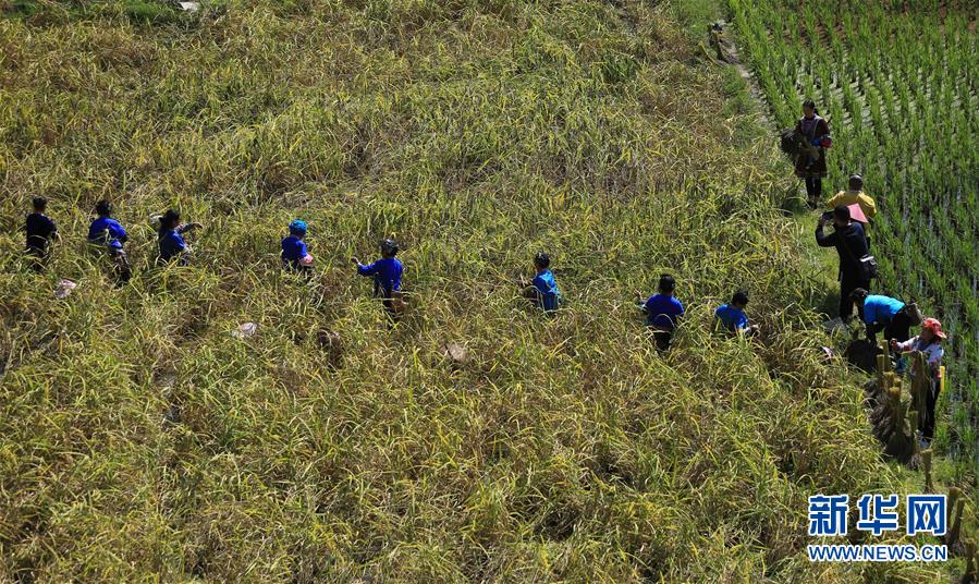 10月30日,在廣西融水苗族自治縣安太鄉(xiāng)元寶村,村民在收獲香糯。 新華社記者 吳建路 攝
