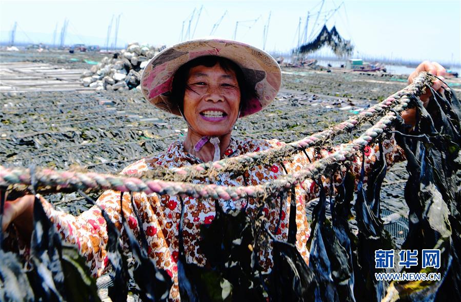 5月17日,在霞浦縣沙江鎮(zhèn)沙江村碼頭,養(yǎng)殖戶在晾曬海帶。