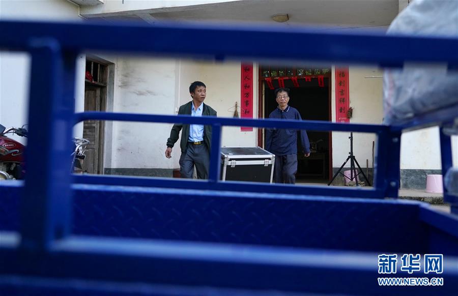 10月30日,曾紀(jì)連(右)和家人將電影放映設(shè)備裝入三輪車(chē),準(zhǔn)備進(jìn)村放映電影。新華社記者 胡晨歡攝