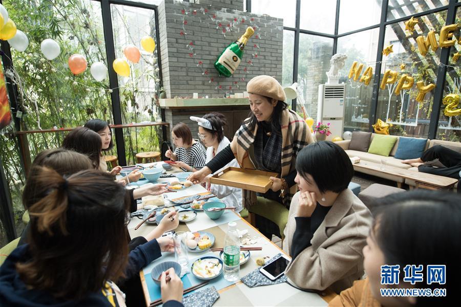 在浙江省杭州市外桐塢村,民宿主人龐代君(右三)在她創(chuàng)立于2016年的“畫·鄉(xiāng)院”精品民宿為客人送早餐(2018年1月3日攝)。外桐塢村是西湖西面群山中的一個小村落,傳統(tǒng)以茶葉生產為主要經濟來源,自2010年以來著力打造藝術村落,目前已擁有藝術家工作室43個、高檔民宿7家、美術館和展廳3家。新華社記者 翁忻旸 攝