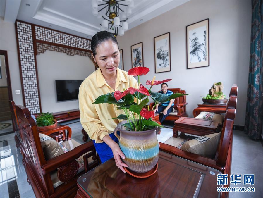 2018年9月26日,東林鎮(zhèn)東升村村民施勤英在新居內布置綠色盆栽植物。新華社記者 徐昱 攝