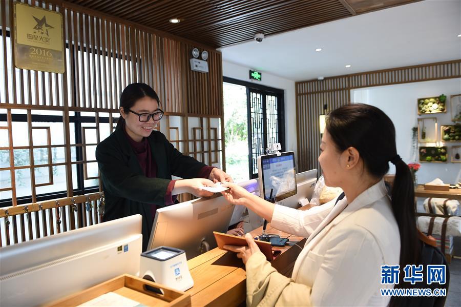 10月31日,在蘇州市吳江區(qū)同里古鎮(zhèn)的一處酒店,工作人員在幫游客辦理入住手續(xù)。新華社記者李博攝