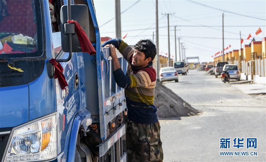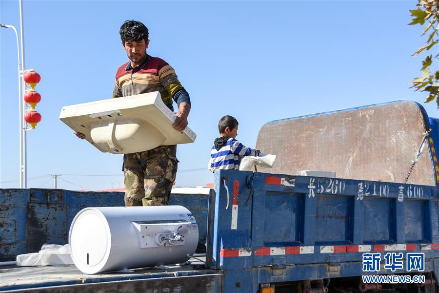 10月28日,買合肉甫·木拉吧在小兒子的幫助下裝運貨物。 新華社記者 關俏俏 攝