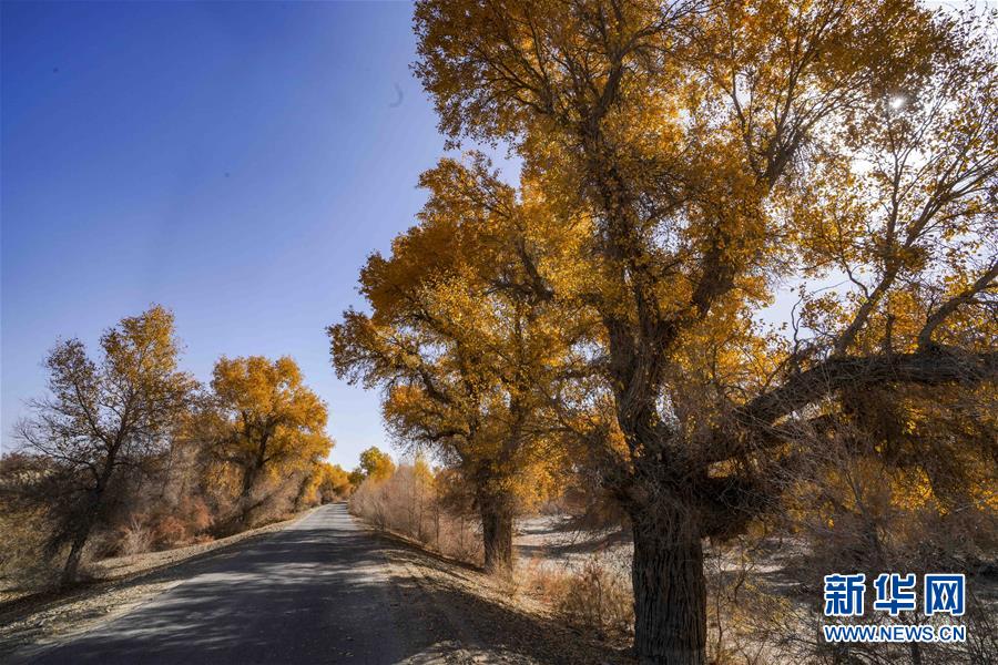 新疆尉犁縣胡楊林深處的一條小路(10月25日攝)。 10月中下旬,靜靜的塔里木河中下游一片金黃。胡楊深處,條條小路蜿蜒綿長通向遠方,引人入勝。 塔里木河是中國最長的內(nèi)陸河,這一區(qū)域原始胡楊林分布較為集中。隨著塔里木河連續(xù)19次向下游生態(tài)輸水,為胡楊林“解渴”,塔河兩岸生態(tài)得到明顯改善,沙地面積逐年減少。 新華社記者趙戈攝