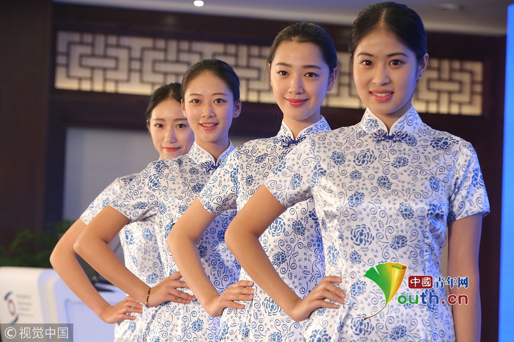 2014年11月17日,世界互聯(lián)網(wǎng)大會直播演練在浙江烏鎮(zhèn)舉行。來自浙江傳媒學(xué)院的大學(xué)生們,身著一襲青花瓷紋旗袍亮相,顯得分外嫵媚,引人注目。