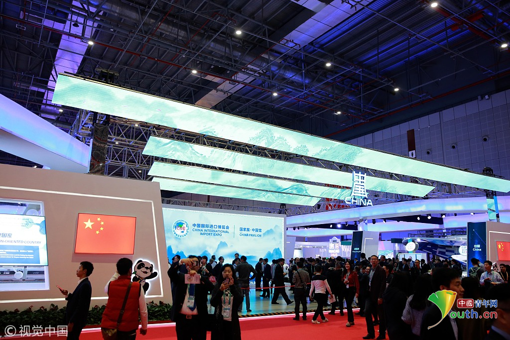 2018年11月6日,上海,首屆中國國際進口博覽會國家展上,共有82個國家、3個國際組織設(shè)立了71個展臺。中國館。視覺中國