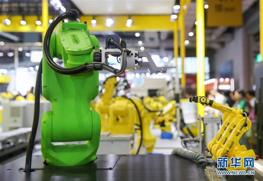 11月6日,日本發(fā)那科公司的協(xié)作機(jī)器人在展臺(tái)上展出。 新華社記者 丁汀 攝