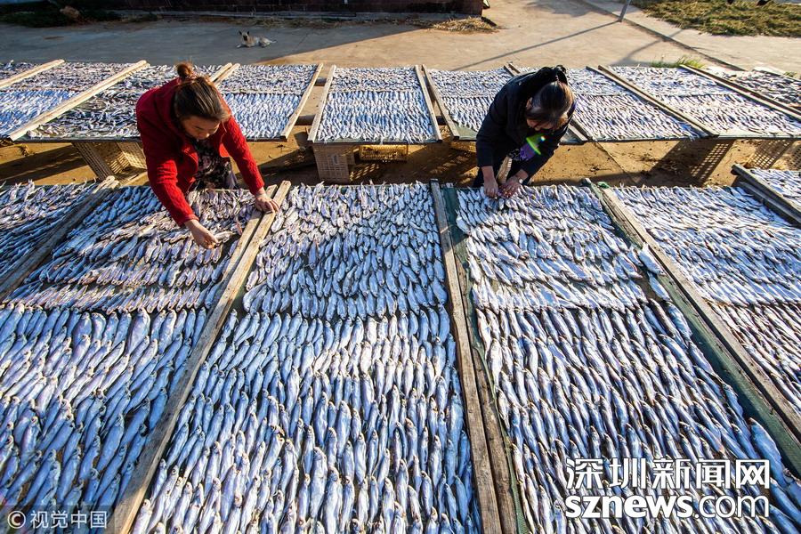 深圳新聞網(wǎng)訊 連日來(lái),秋風(fēng)颯爽,艷陽(yáng)高照,當(dāng)?shù)貪O村迎來(lái)豐收季,漁民們?cè)谯蛾?yáng)湖畔的漁港岸邊和屋前屋后晾曬魚蝦,忙的不亦樂(lè)乎。