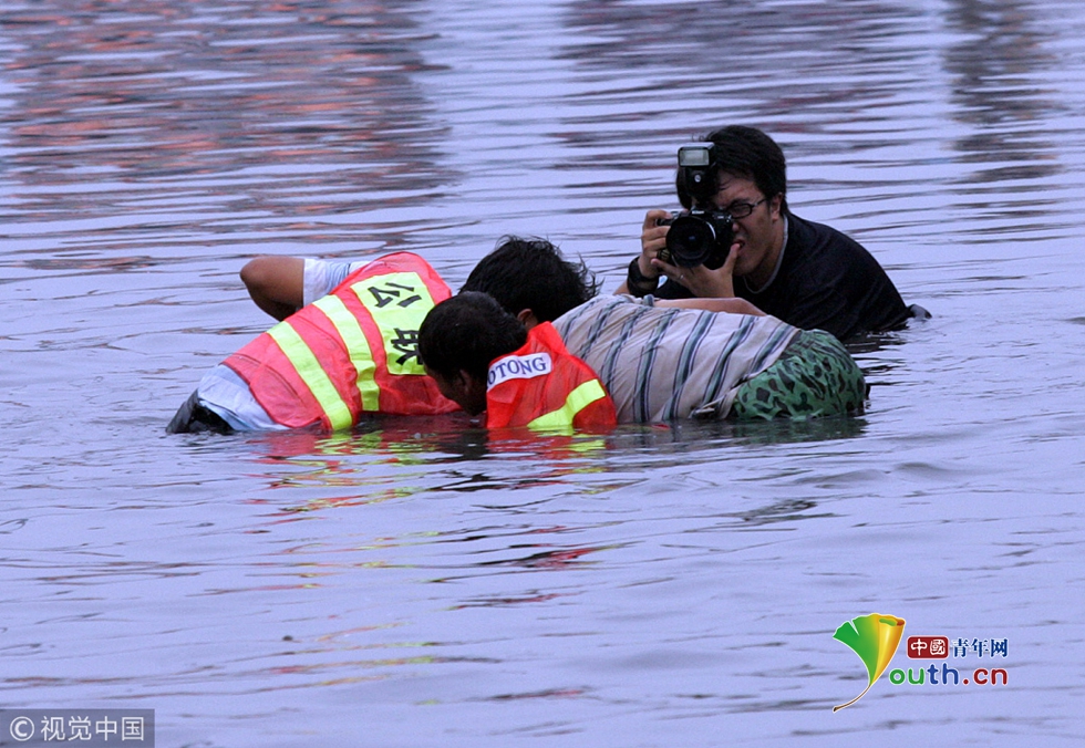 2007年8月6日,北京北三環(huán)安華橋雨后出現(xiàn)積水,這段北京最繁忙的道路之一的路段一度交通中斷,排險人員緊急趕到現(xiàn)場做出排水等應(yīng)急舉措。圖片作者:王玨茜/視覺中國