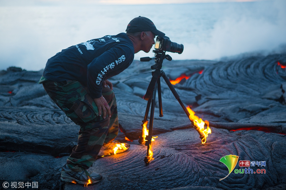 距離巖漿如此之近拍照十分危險。攝影師Kawika Singson在拍攝過程中,經(jīng)歷了極大的危險。流入海洋的巖漿量,風(fēng)向,以及巖漿基床的結(jié)實程度等風(fēng)險都需要考慮。 圖片來源:視覺中國