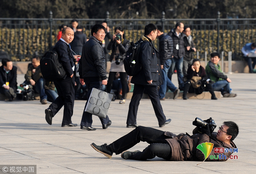 2013年3月5日,北京,一名攝影記者躺在地上仰拍人民大會(huì)堂外景。 圖片作者:有待/視覺(jué)中國(guó)
