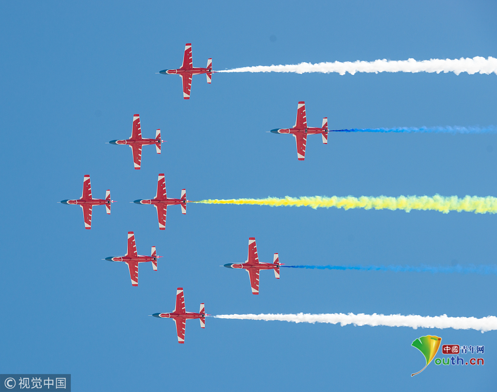 2018年11月8日,廣東珠海,第十二屆中國國際航展第三天??哲姟鞍艘弧憋w行表演隊(duì)的隊(duì)員們,發(fā)揚(yáng)連續(xù)作戰(zhàn)精神,給觀眾們表演了七機(jī)分組開花、四機(jī)編隊(duì)橫滾等高難動作,受到觀眾們的稱贊。視覺中國