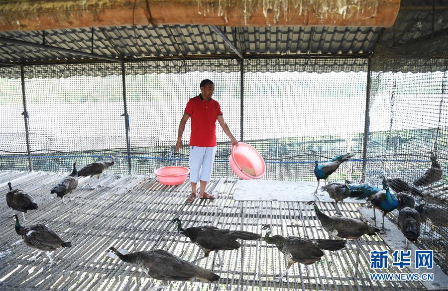 5月16日,在重慶市銅梁區(qū)永嘉鎮(zhèn)高龍村,閻仁兵在養(yǎng)殖場內(nèi)給藍(lán)孔雀喂食。新華社記者 王全超 攝