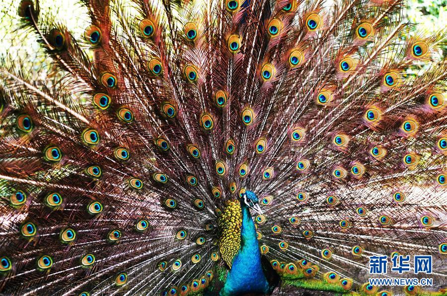 5月16日,在重慶市銅梁區(qū)永嘉鎮(zhèn)高龍村藍(lán)孔雀養(yǎng)殖場內(nèi),一只藍(lán)孔雀開屏。 新華社記者 王全超 攝