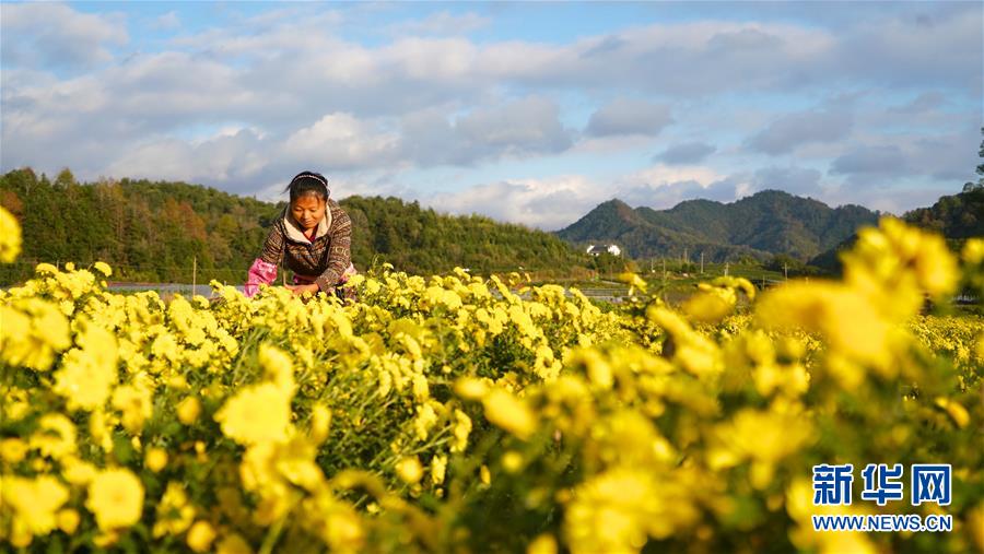 11月8日,婺源縣思口鎮(zhèn)農戶在采摘皇菊。 新華社記者 胡晨歡 攝