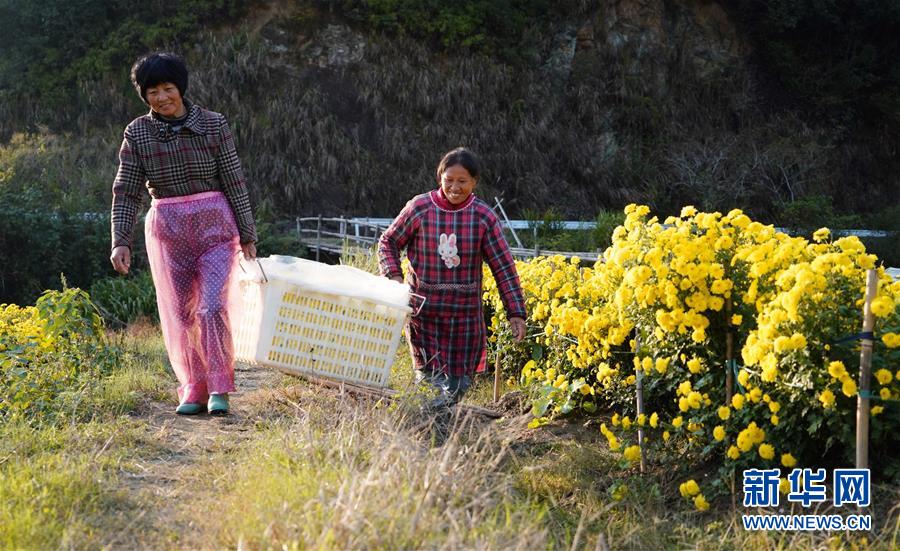 11月8日,婺源縣思口鎮(zhèn)農戶在運送采摘的皇菊。新華社記者 胡晨歡 攝