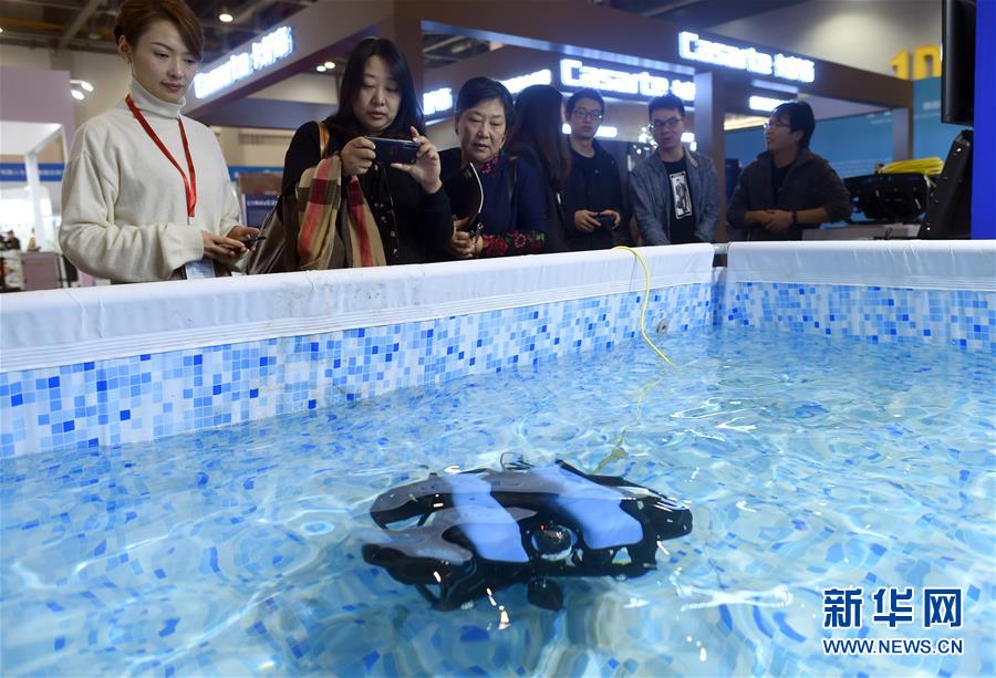11月10日,人們在展會(huì)現(xiàn)場觀看展出的一款小型水下機(jī)器人。 新華社記者韓傳號(hào)攝