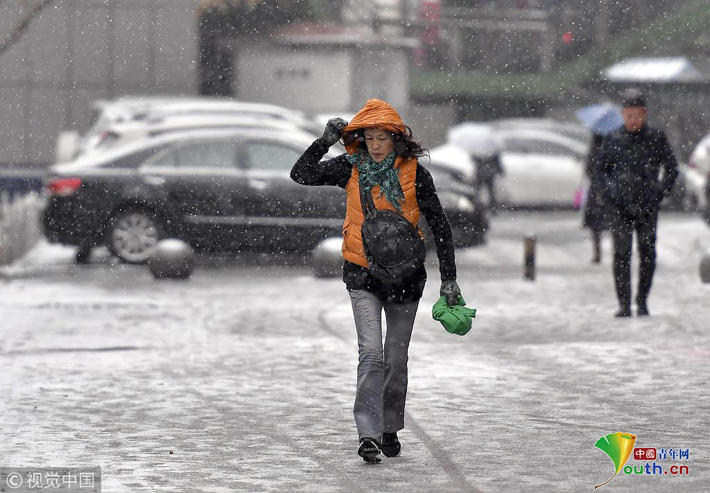 2018年11月12日,持續(xù)濃霧天氣的新疆烏魯木齊市,又迎來一場雨雪天氣,氣溫隨之驟降。圖為在風雪中外出的民眾腳步匆匆。圖片作者:劉新