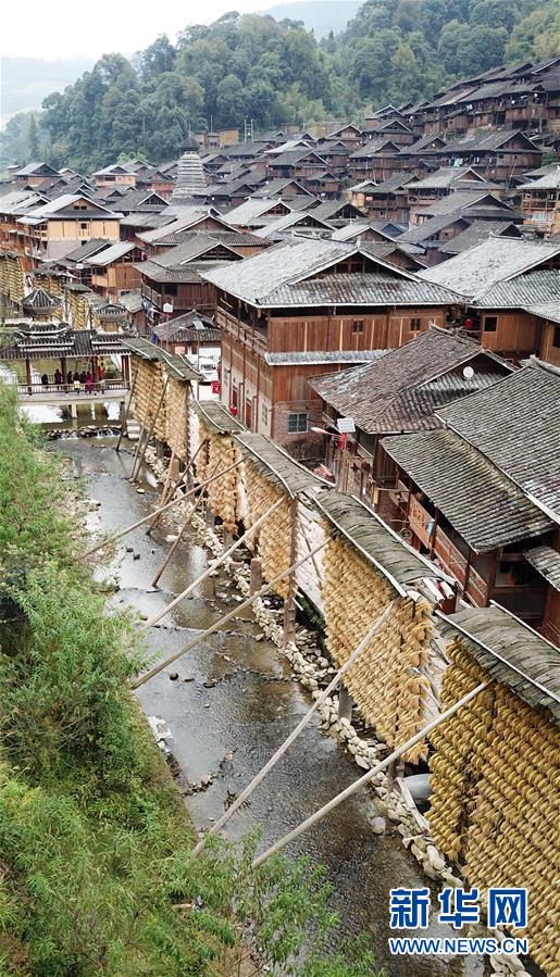 這是貴州省黔東南苗族侗族自治州從江縣高增鄉(xiāng)占里村一處屋檐下晾曬的稻谷(10月17日攝)。 金秋時(shí)節(jié),農(nóng)民們忙著收獲成熟的農(nóng)作物,喜迎豐收。 新華社記者陳曄華攝