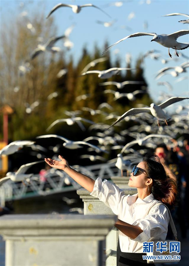 近日,云南省昆明市陽光明媚、氣候宜人,不少市民和游客來到滇池大壩、大觀公園等地,觀賞前來越冬的紅嘴鷗。
