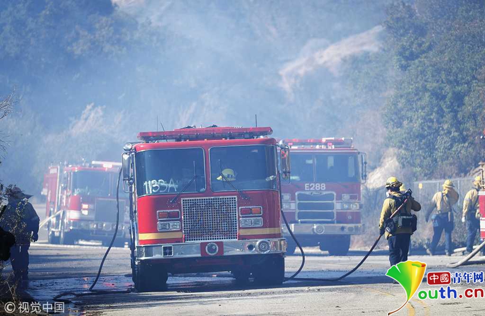 該郡第二大城市千橡樹(shù)市(Thousand Oaks)等很多地方房屋被毀,高速公路封閉,居民緊急疏散。洛杉磯郡圣蓋博市(San Gabriel)警察局警官日瓦戈(O. Zhivaga)和同事們當(dāng)天清晨即受命馳援文圖拉郡,保護(hù)當(dāng)?shù)鼐用窈拓?cái)產(chǎn)安全。圖為消防車行駛在已封閉的公路上,天空中濃煙滾滾。
