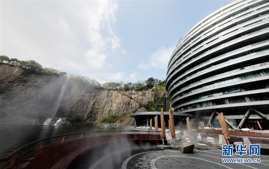 一條人造瀑布從酒店主體建筑旁的礦坑頂部流下(11月13日攝)。 位于上海松江的世茂洲際酒店11月15日正式開門營業(yè)。這家在一個(gè)廢棄采石礦坑內(nèi)建成的酒店成為上海又一新景。 新華社記者 方喆 攝