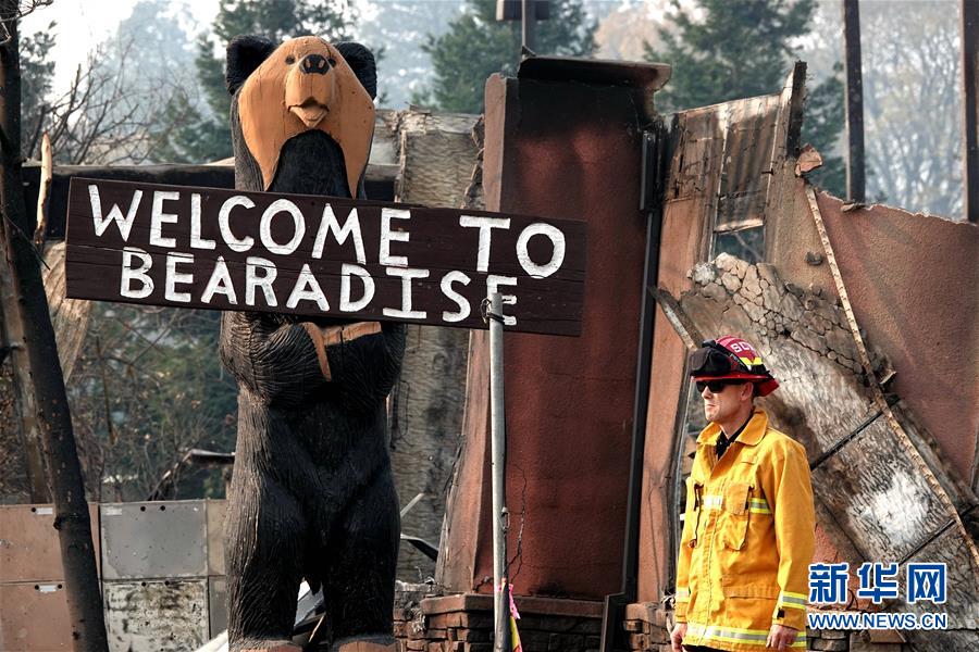 11月18日,在美國(guó)加利福尼亞州比尤特縣天堂鎮(zhèn),一名消防人員站在廢墟旁。 新華社記者吳曉凌攝